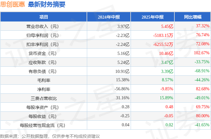 据证券之星公开数据整理,近期思创医惠(300078)发布2025年中报。截至本报告期末,公司营业总收入5.45亿元,同比上升37.32%,归母净利润-5183.15万元,同比上升76.74%。按单季度数据看,第二季度营业总收入1.36亿元,同比下降31.44%,第二季度归母净利润-3227.25万元,同比上升79.19%。本报告期思创医惠公司应收账款体量较大,当期应收账款占最新年报营业总收入比达50.24%。